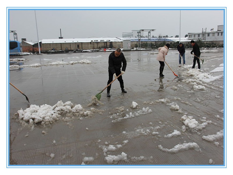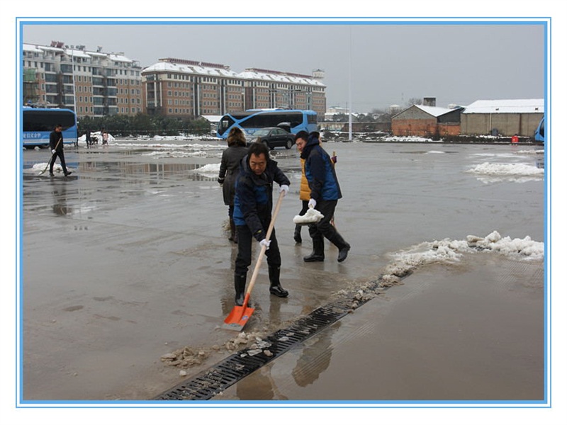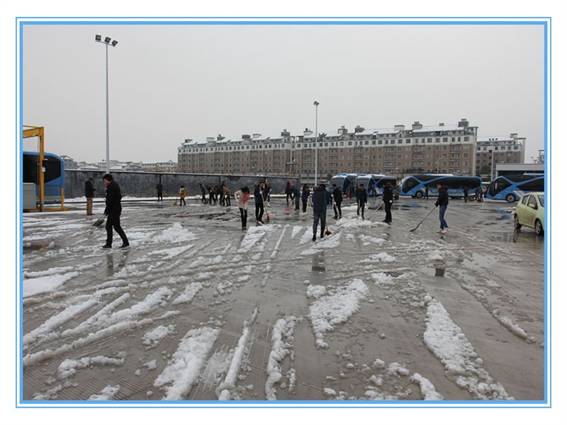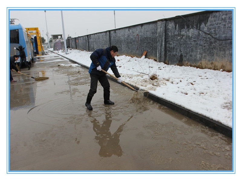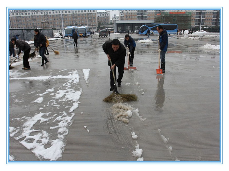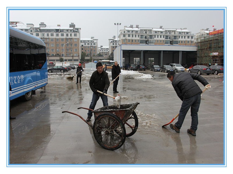 經(jīng)過一天一夜的積雪,皚皚白雪覆蓋了BRT婺城樞紐站,站內(nèi)部分路面有冰凍,對快速公交的安全造成嚴(yán)重影響。公司員工達(dá)到站內(nèi)后,迅速拿起鐵鍬、掃把,對積雪冰凍進(jìn)行清理。清雪工作組織有序、分工明確,先用鐵鍬破除冰凍,將積雪集中堆積,接著用手推車將積雪運到制定區(qū)域清倒,然后用掃帚掃凈積水。經(jīng)過大家3個多小時的齊心奮斗,現(xiàn)場積雪和冰凍全部清除干凈。