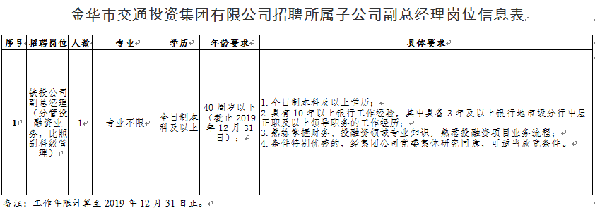 2.資格條件。詳見《金華市交通投資集團(tuán)有限公司招聘所屬子公司副總經(jīng)理崗位信息表》。